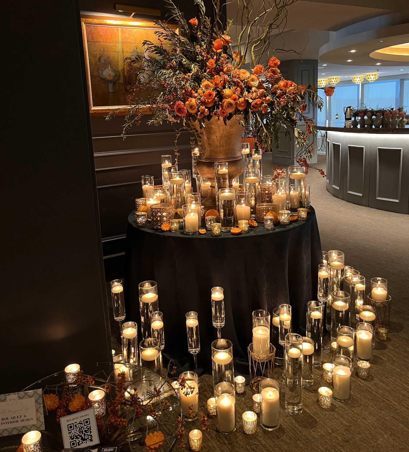 Floral designer Olga Fisher worked her magic and created a massive floral arrangement in a 24-inch urn featuring roses, bittersweet, olive branches, curly willow, amaranthus and oranges. The display also included more than 100 lit candles.